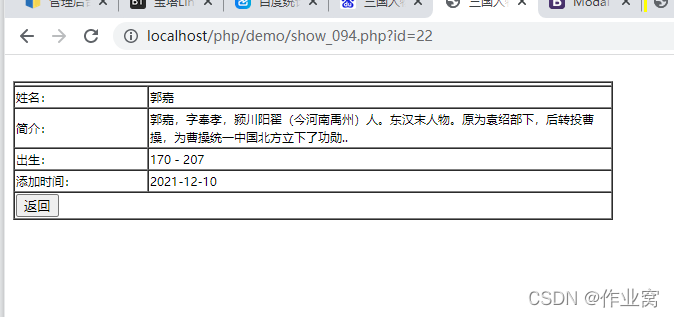 ? 步骤: 在表格循环显示的数据后添加显示超连接,并绑定ID <td><a href="show_094.php?id=<?php echo $_rows_094['id_094']; ?>">显示</a></td> 创建show_094.php的页面 接收id的值 组装查询sql语句; <?php $_query_094 = mysqli_query($conn_094, "select * from list where id_094 = " . $_GET['id']); $_rows_094 = mysqli_fetch_array($_query_094, MYSQLI_ASSOC); ?> 把查询 出来的值显示到表格中  ? ? 添加返回按钮。 (操作前截图、操作后截图、截图和实验过程文字说明)
