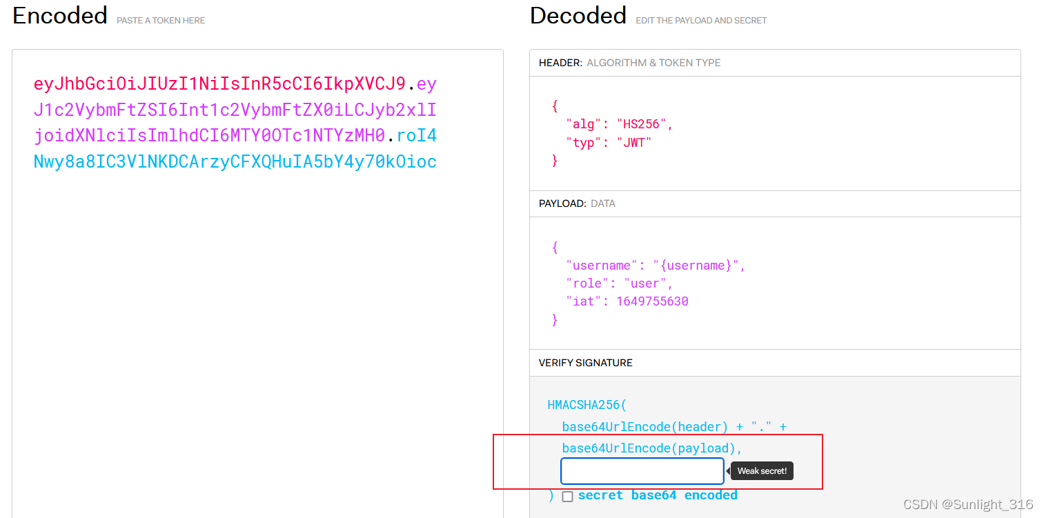 那么我们就可以利用这段Token伪造管理员请求去得到flag 打开jwt.io:要爆破的就是下面这个检验码 打开hashcat,设置掩码爆破或者暴力爆破,5分钟出来了: 或者rockyou.txt,很多密码,秒出结果 密钥是:owasp