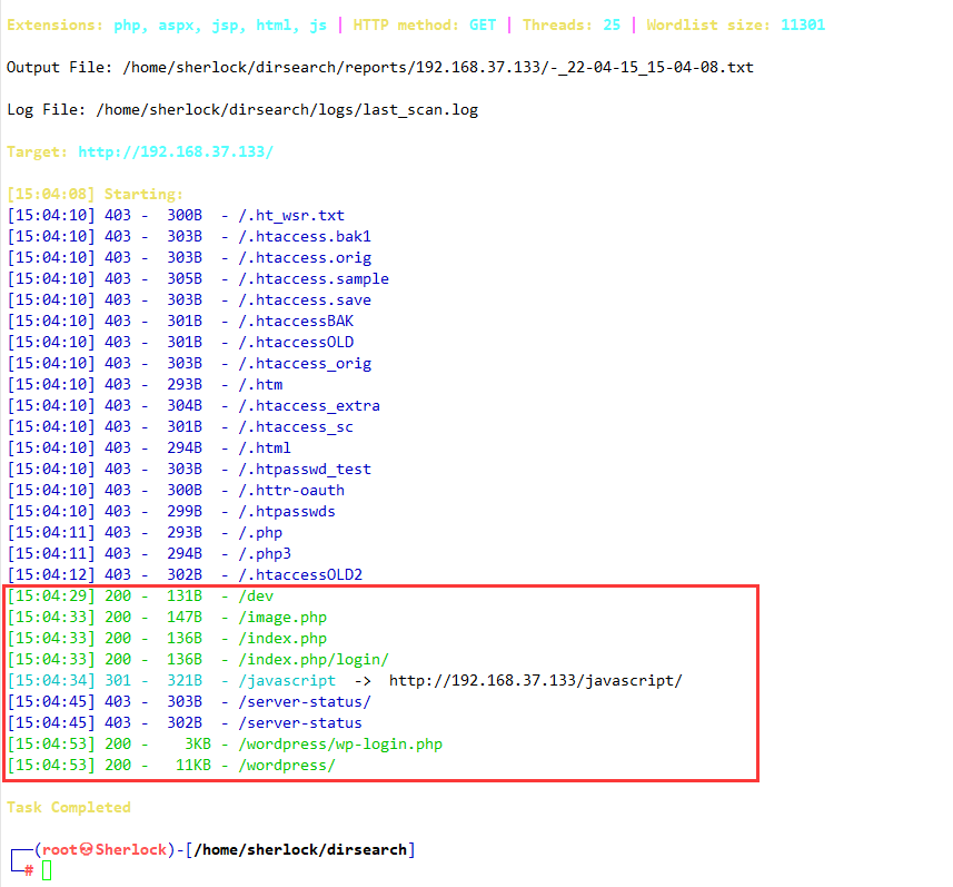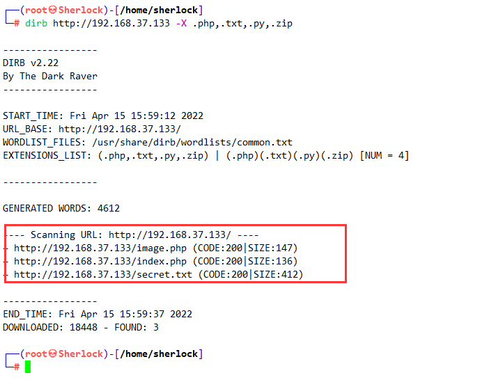dirb http://192.168.37.133 -X .php,.txt,.py,.zip ?