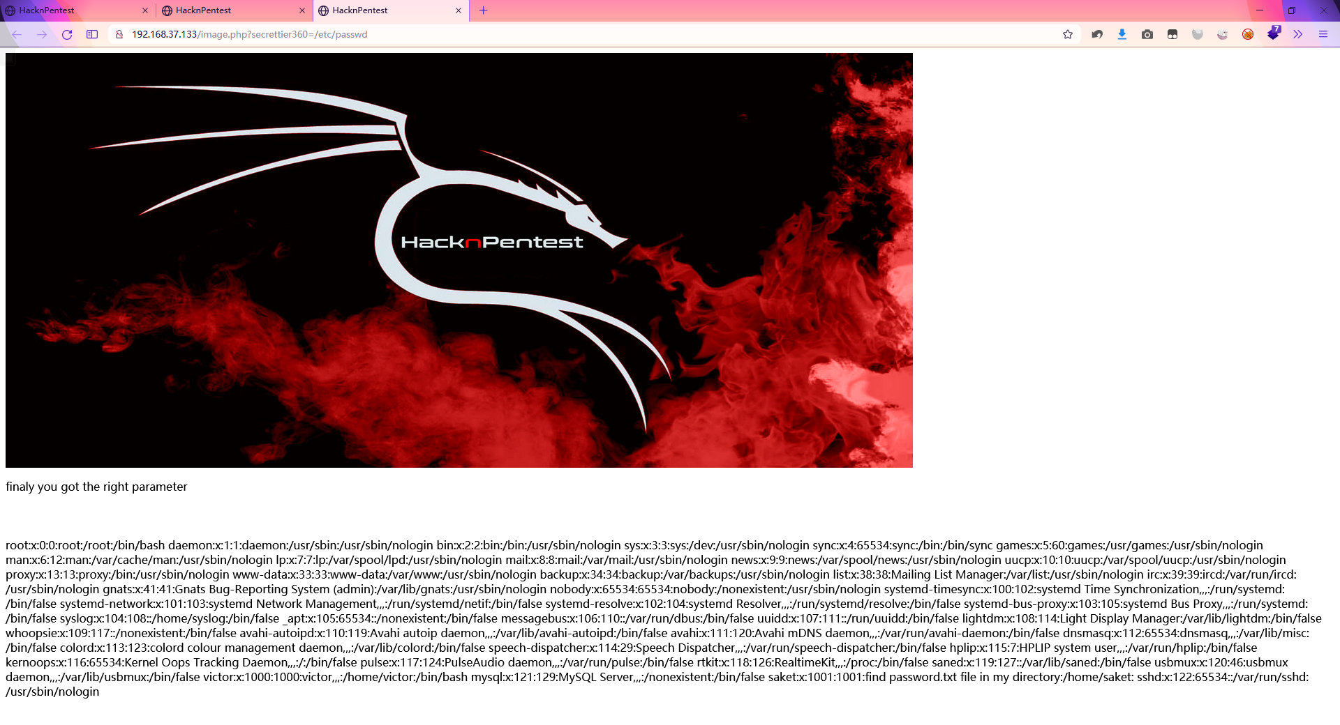 root:x:0:0:root:/root:/bin/bash daemon:x:1:1:daemon:/usr/sbin:/usr/sbin/nologin bin:x:2:2:bin:/bin:/usr/sbin/nologin sys:x:3:3:sys:/dev:/usr/sbin/nologin sync:x:4:65534:sync:/bin:/bin/sync games:x:5:60:games:/usr/games:/usr/sbin/nologin man:x:6:12:man:/var/cache/man:/usr/sbin/nologin lp:x:7:7:lp:/var/spool/lpd:/usr/sbin/nologin mail:x:8:8:mail:/var/mail:/usr/sbin/nologin news:x:9:9:news:/var/spool/news:/usr/sbin/nologin uucp:x:10:10:uucp:/var/spool/uucp:/usr/sbin/nologin proxy:x:13:13:proxy:/bin:/usr/sbin/nologin www-data:x:33:33:www-data:/var/www:/usr/sbin/nologin backup:x:34:34:backup:/var/backups:/usr/sbin/nologin list:x:38:38:Mailing List Manager:/var/list:/usr/sbin/nologin irc:x:39:39:ircd:/var/run/ircd:/usr/sbin/nologin gnats:x:41:41:Gnats Bug-Reporting System (admin):/var/lib/gnats:/usr/sbin/nologin nobody:x:65534:65534:nobody:/nonexistent:/usr/sbin/nologin systemd-timesync:x:100:102:systemd Time Synchronization,,,:/run/systemd:/bin/false systemd-network:x:101:103:systemd Network Management,,,:/run/systemd/netif:/bin/false systemd-resolve:x:102:104:systemd Resolver,,,:/run/systemd/resolve:/bin/false systemd-bus-proxy:x:103:105:systemd Bus Proxy,,,:/run/systemd:/bin/false syslog:x:104:108::/home/syslog:/bin/false _apt:x:105:65534::/nonexistent:/bin/false messagebus:x:106:110::/var/run/dbus:/bin/false uuidd:x:107:111::/run/uuidd:/bin/false lightdm:x:108:114:Light Display Manager:/var/lib/lightdm:/bin/false whoopsie:x:109:117::/nonexistent:/bin/false avahi-autoipd:x:110:119:Avahi autoip daemon,,,:/var/lib/avahi-autoipd:/bin/false avahi:x:111:120:Avahi mDNS daemon,,,:/var/run/avahi-daemon:/bin/false dnsmasq:x:112:65534:dnsmasq,,,:/var/lib/misc:/bin/false colord:x:113:123:colord colour management daemon,,,:/var/lib/colord:/bin/false speech-dispatcher:x:114:29:Speech Dispatcher,,,:/var/run/speech-dispatcher:/bin/false hplip:x:115:7:HPLIP system user,,,:/var/run/hplip:/bin/false kernoops:x:116:65534:Kernel Oops Tracking Daemon,,,:/:/bin/false pulse:x:117:124:PulseAudio daemon,,,:/var/run/pulse:/bin/false rtkit:x:118:126:RealtimeKit,,,:/proc:/bin/false saned:x:119:127::/var/lib/saned:/bin/false usbmux:x:120:46:usbmux daemon,,,:/var/lib/usbmux:/bin/false victor:x:1000:1000:victor,,,:/home/victor:/bin/bash mysql:x:121:129:MySQL Server,,,:/nonexistent:/bin/false saket:x:1001:1001:find password.txt file in my directory:/home/saket: sshd:x:122:65534::/var/run/sshd:/usr/sbin/nologin