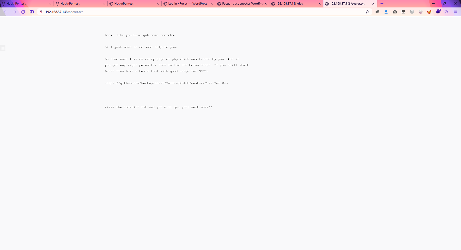 从话中我们知道使用 fuzz 模糊测试在某个页面找漏洞参数,burp suite?或者 wfuzz,话中链接就是 wfuzz 的使用,最后提示看?location.txt ,但是每个页面都找不到,应该是接下来 wfuzz 使用的参数内容,就像 DC-9 中我们使用 wfuzz 的流程一样