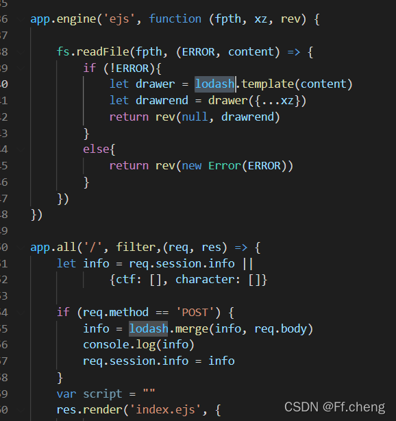 ¿´Ï¿â,Óõ½ÁËlodash,Õâ¸ö°æ±¾´æÔÚ©¶´,npm install һϱ¾µØµ÷ÊÔ  ´Ó´úÂëÖпÉÒÔ¿´µ½merge´æÔÚÔÐÍÎÛȾ,È»ºóÓõ½ÁËtemplateº¯Êý  È»ºóÕÒµ½ÁËÎÄÕ ´Ó Lodash ÔÐÍÁ´ÎÛȾµ½Ä£°å RCE - °²È«¿Í,°²È«×ÊѶƽ̨ (anquanke.com),ÓиöÅäºÏ lodash.template ʵÏÖ RCE,ÎÛȾ sourceURL