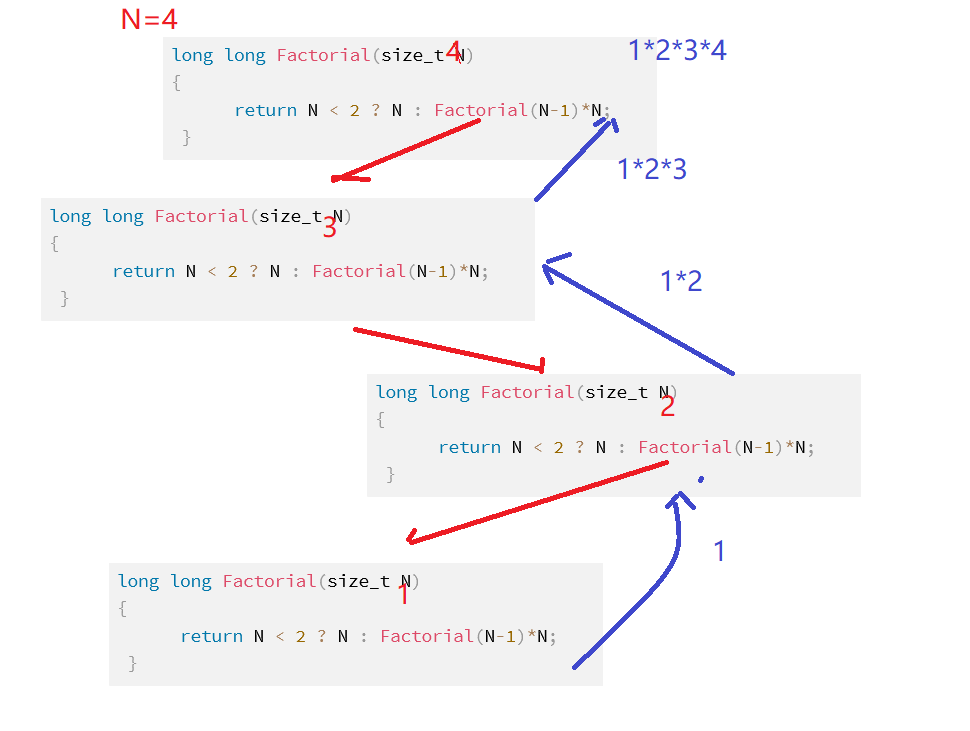 可以看到N=4递归了4次 时间复杂度:O(N)