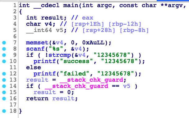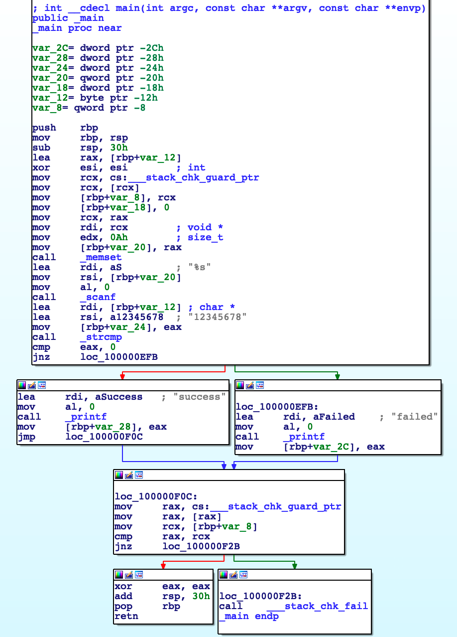 上面的代码编译后,会生成一个可执行程序,咱们来对这个可执行文件进行一下反编译,看看能看到什么? 下图是在反编译神器IDA中,可执行文件反编译出来的汇编指令图: 再认真一看,main函数中有一个分支判断,根据判断的结果,走入左右两个分支,分别输出"success"和"failed"。 如果新手看不懂上面的反汇编图,那可以再使用IDA的神级功能:F5反编译高级语言功能,直接将上面的汇编程序再进一步还原成C语言。