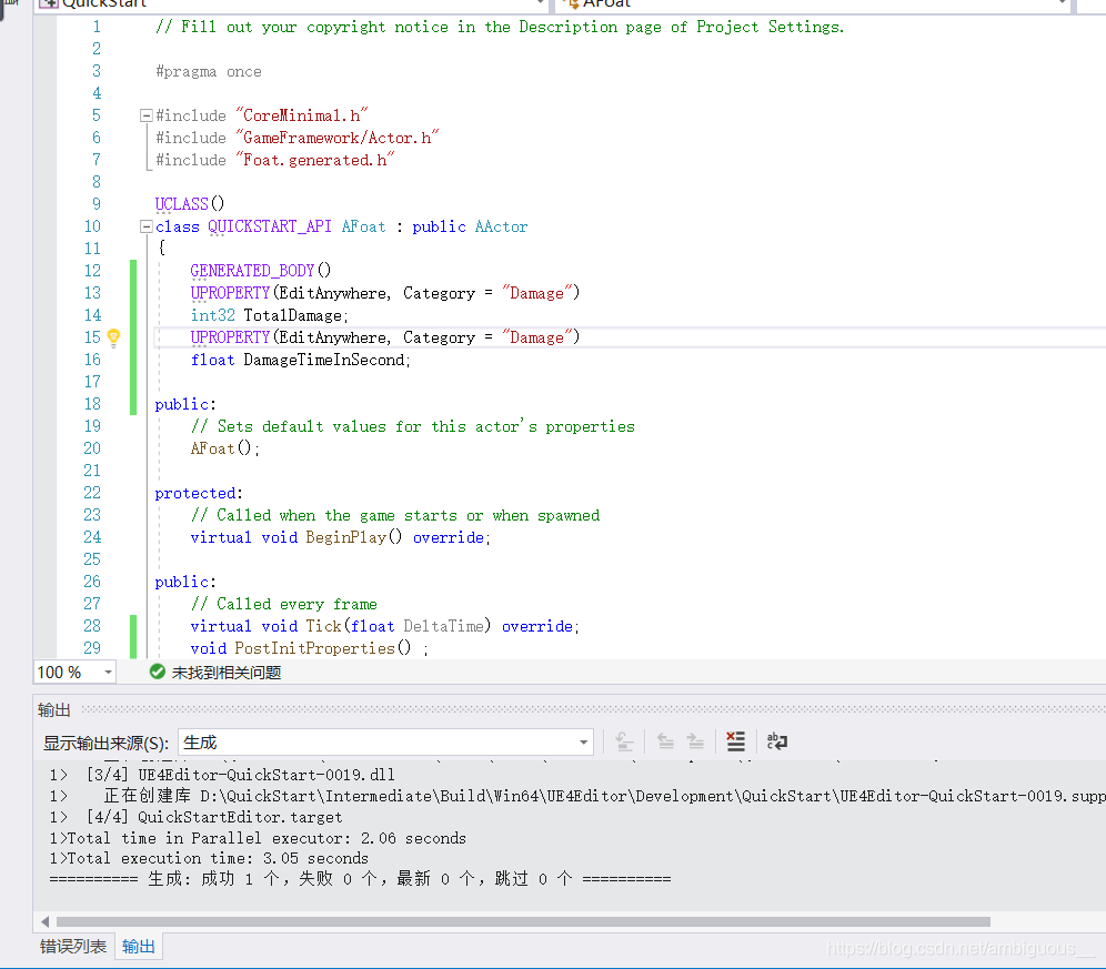 ?后来经过我的慢慢思索和试验,发现当UPROPERTY()宏有一些需要暴露给蓝图进行读或者写的参数的时候(如:BlueprintReadWrite,BlueprintReadOnly等),就会发生这个错误,而没有这些参数时,系统就能编译通过。