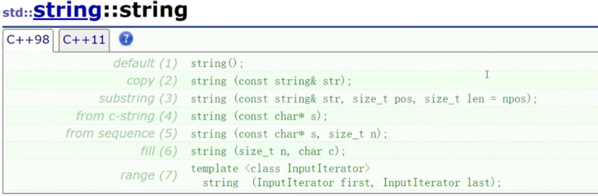 | string() | 构造空的string类对象,即空字符串 | | string(const char* s) | 用C-string来构造string类对象 | | string(const string&s) | 拷贝构造函数 | | string(size_t n, char c) | string类对象中包含n个字符c |