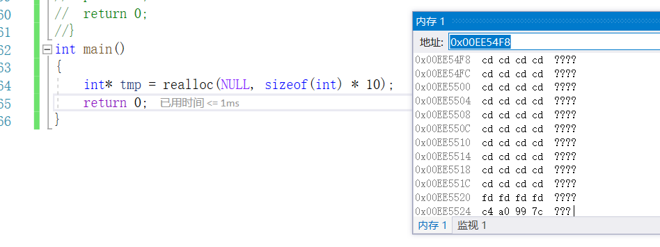 翻译出来就是在内存当中申请一块连续可用的空间,返回这块空间的指针 *如果开辟成功,则返回一个指向开辟好空间的指针。 *如果开辟失败,则返回一个NULL指针,因此malloc的返回值一定要做检查。 返回值的类型是 void ,所以malloc函数并不知道开辟空间的类型,具体在使用的时候使用者自己来决定。 如果参数 size 为0,malloc的行为是标准是未定义的,取决于编译器 👀这里我们写一个代码看看基本使用