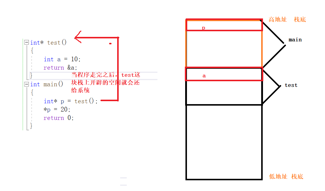所以这里当然在main的时候p就已经是一块随机的空间,可能已经被分配给其他使用,这里在win测试的,这个内存图实际上没多大意义,vs2019,x64中验证的,vs编译器本身为了安全,会对地址进程重新分配,但是要记住以下几点:1.栈区内存的使用习惯:先使用高地址空间,在使用低地址空间;2.数组随着下标的增长地址是由低到高变化的(Linux标准的,也是编译器没有经过任何加工的布局,下道题我们用x86验证,就可以模拟上述规则了), 指针的加减与指针的类型有关,加减1次走过指针的类型大小 void*是不能解引用和进行加减的