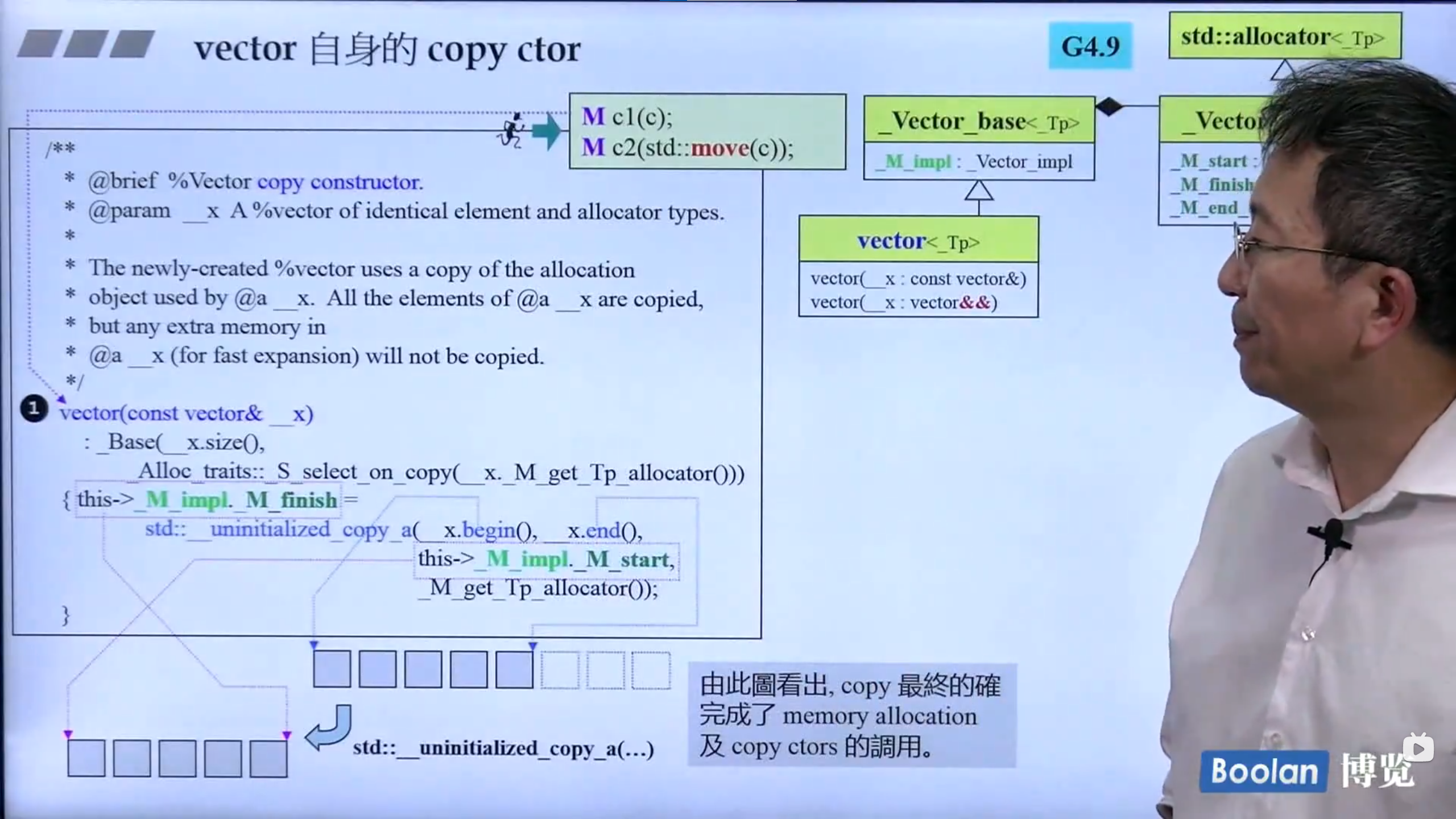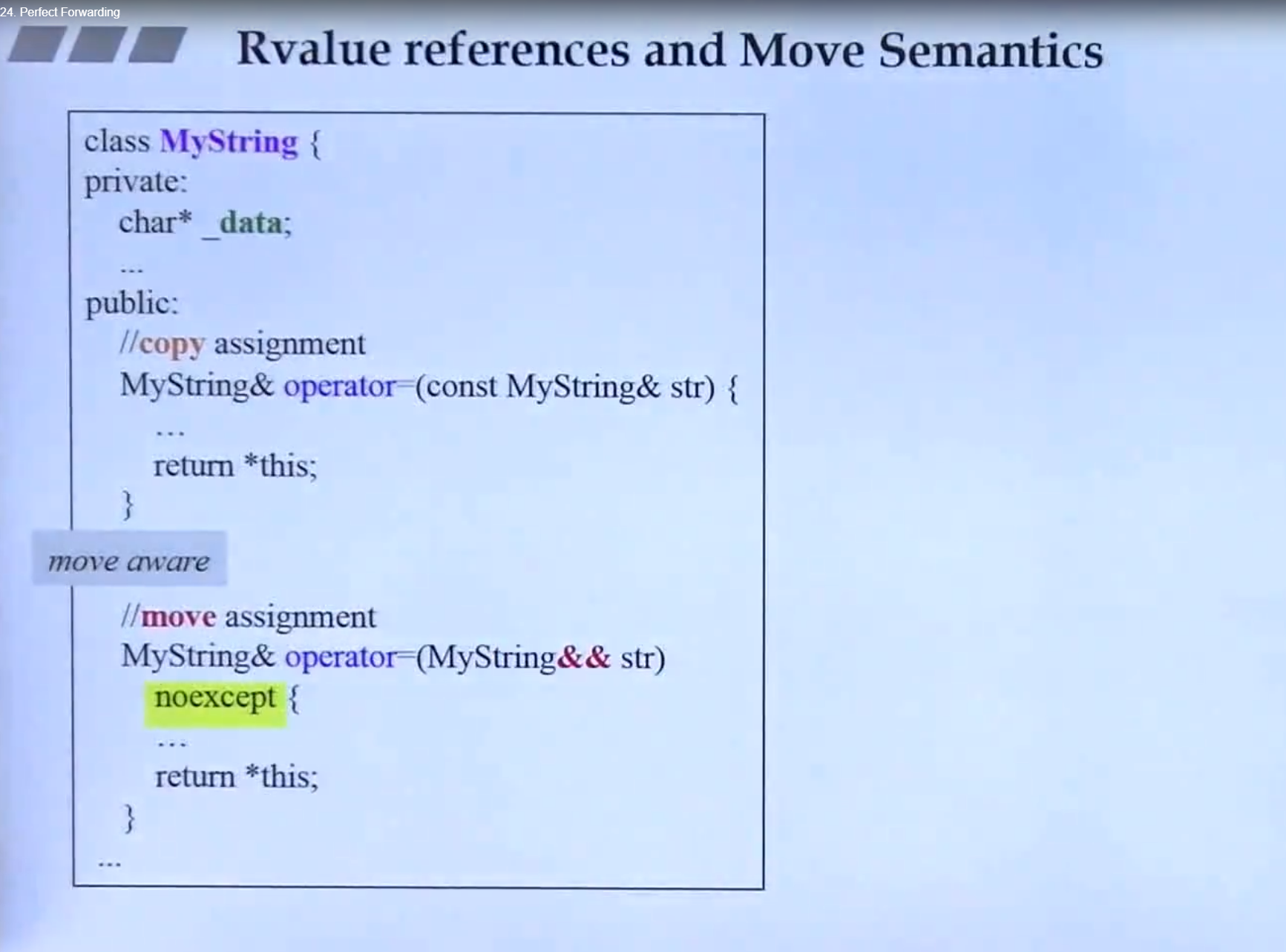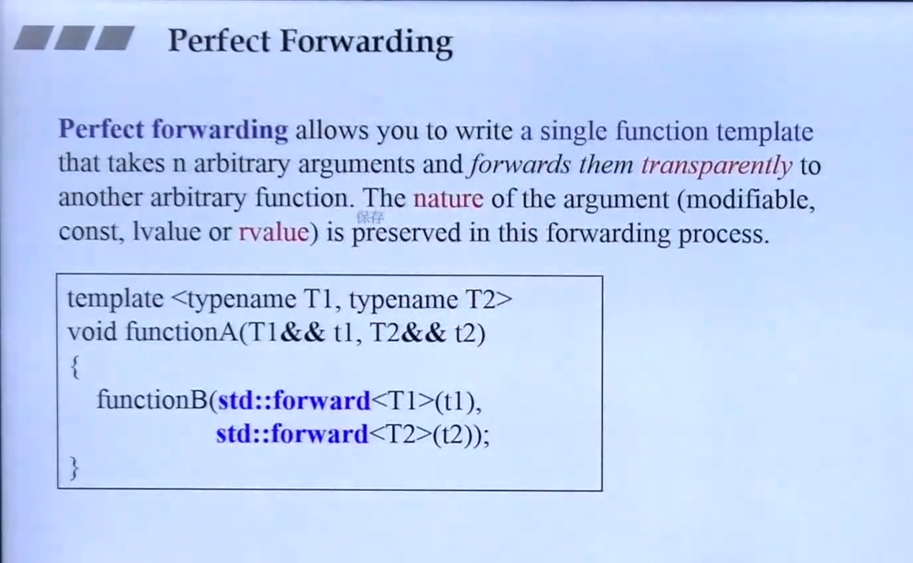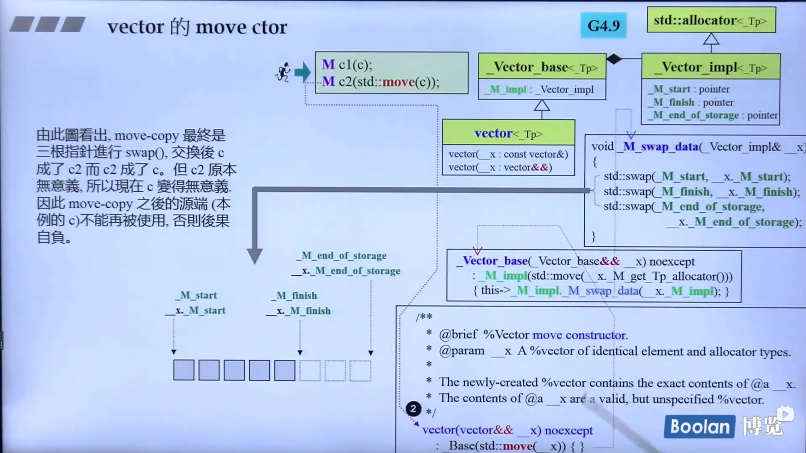 源代码: 第一个版本G2.9是C++2.0之前的,只有一个版本。4.9即有两个版本。  再回到这张图:  这里用insert之后再交给MyString的move ctor去处理,经过了交接,会导致不完美。   用std::forward就会使用完美的快递,再往下看:  从这个例子我们可以看到,这里2明明是一个右值,但是forward(2)里面再调用process函数的时候却调用了process左值的版本,这便是不完美的转交。 原因是传入i之后,是一个具名变量named object 而从forward(move(a))也发现会出错。 所以要解决,这就是不完美的转发Unperfect Forwarding 下面是标准库的做法: