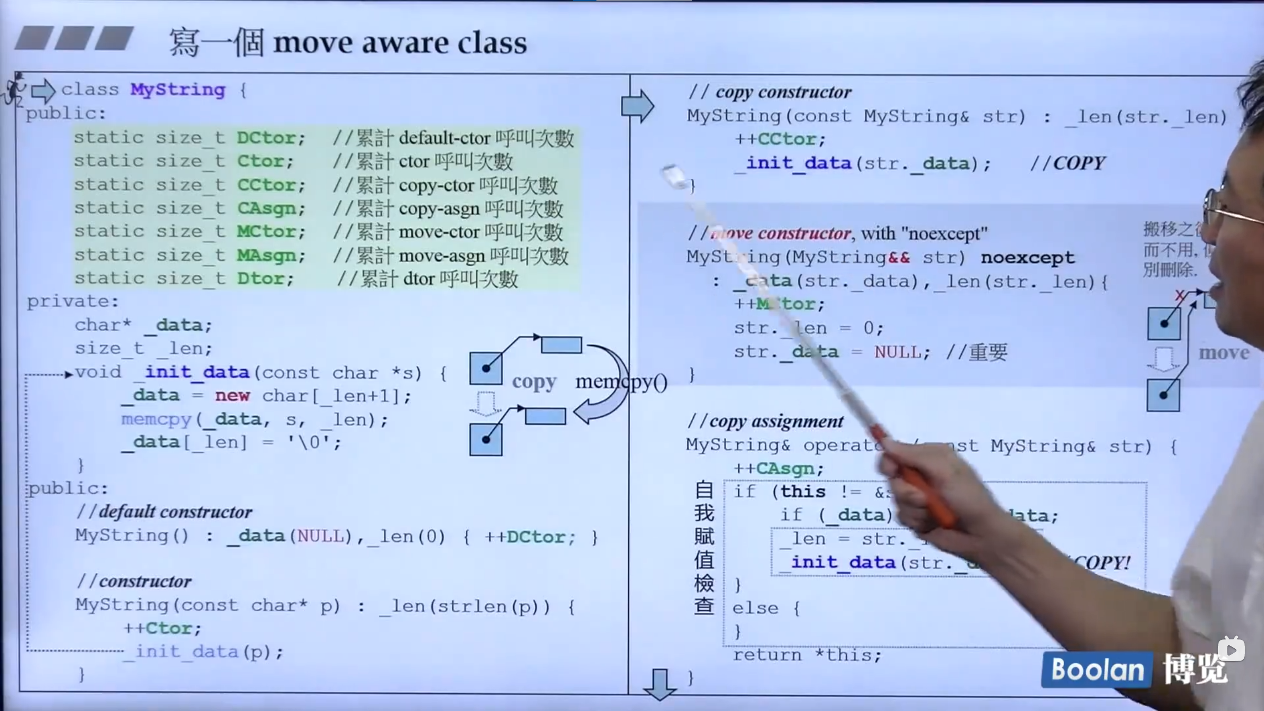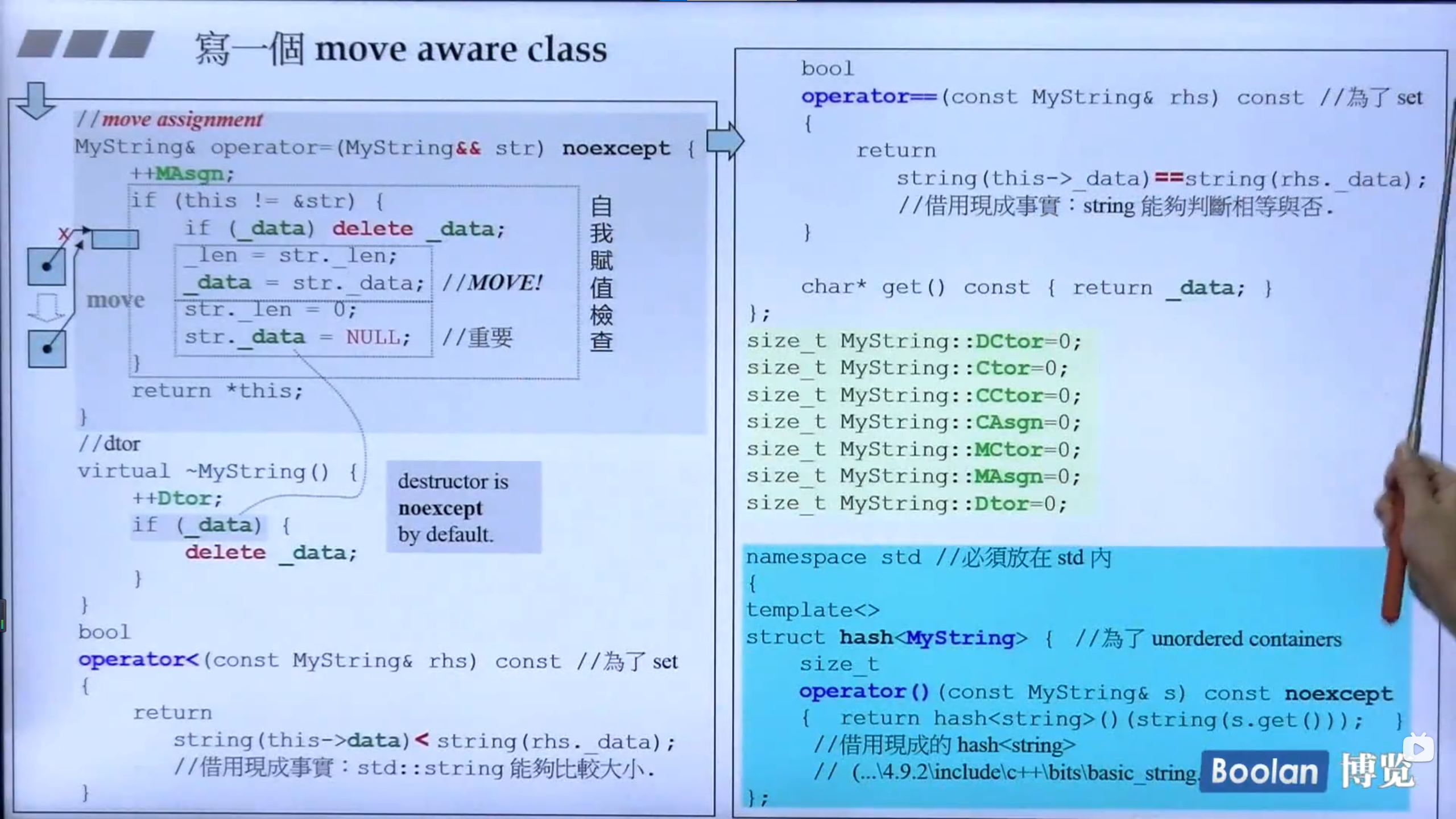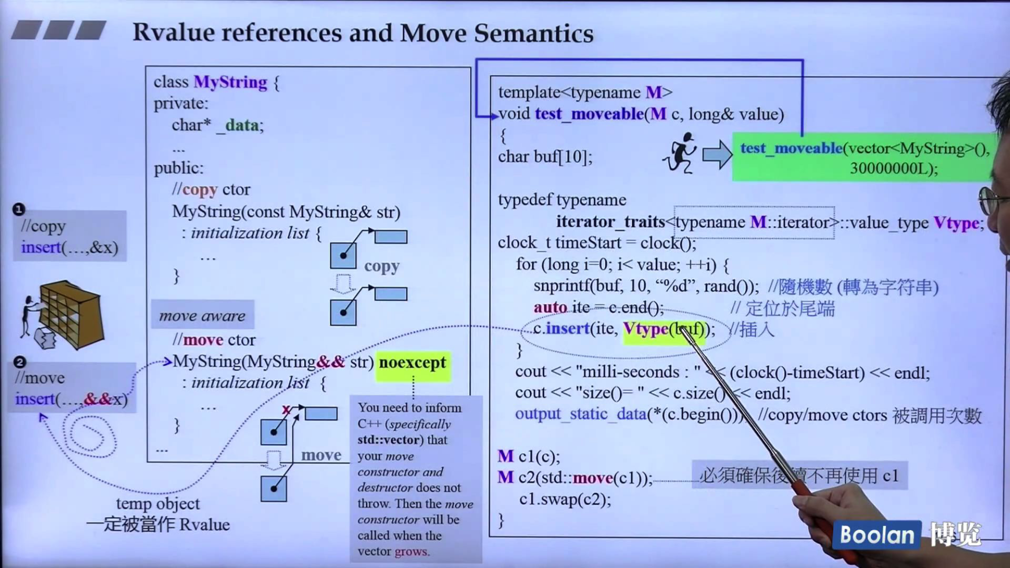 我们熟知的vector的insert是copy,但是2.0有了新的。 这里的例子会调用2,因为遇到了临时对象,是一个右值,则会调用右值引用的版本。 而所谓偷(move搬移)一开始就是浅拷贝,而浅拷贝是危险的,所以拷贝完会把原来的指针打断。这才是偷的精髓,即move之后原来的就会打断,就不能再使用了。 在例子中就是,原来这个右值Vtype(buf)临时对象,在move之后自身被打断,不能再用了,这很好,因为本身就是临时对象。 还有一种情况是,insert的是一个左值而不是临时对象,但是我很清楚之后不会再用他,那么我也可以让他走move这种方式。但是明明是左值想要走右值的路怎么办呢? 标准库于是给了std::move这样一个东西,只要把左值给进去就相当于拿到了它的Rvalue reference,就会走第二条路(move的路)