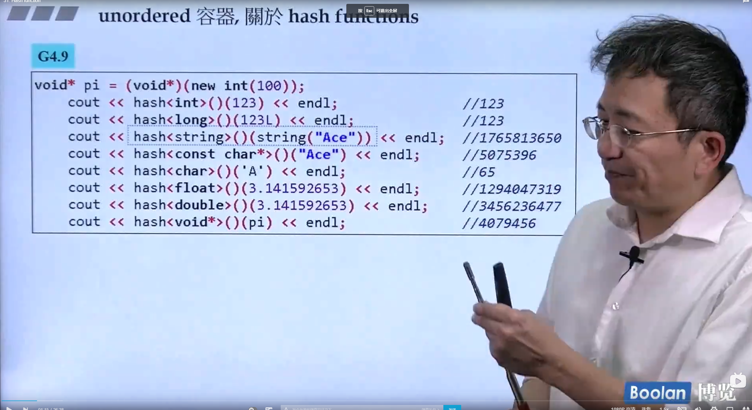 下图,标准库有一些hash function,可以用来针对基本类型:  比如这里hash()就做了一个临时对象,是一个hash function,然后就可以当作函数继续调用: hash()(123) 可以看到他们对应的hash code 看到G2.9版本的定义,就是模板的特化:  针对字符串,有下面这样的经验公式:  而2.9的时候对于浮点数都没有这样的hashfunction,而G4.9之后就有了    如上,有这么一些特化版本。   G4.9一路特化,调用了_Hash_bytes函数,只有声明没有定义,怀疑是编译已经放入二进制文件去了。