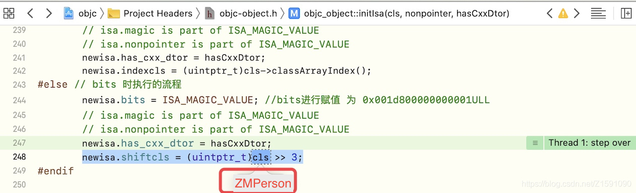 此时查看cls,是ZMPerson类 shiftcls赋值的逻辑是将 ZMPerson进行编码后,右移3位