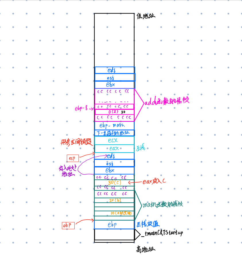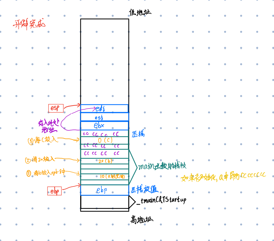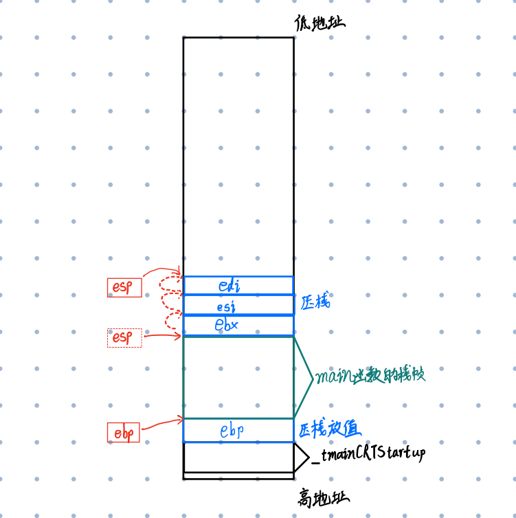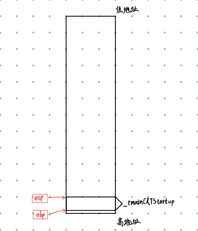 程序开始执行,首先ebp指向_tmainCRTStrtup的高地址,esp指向_tmainCRTStrtup的低地址,此时他们共同维护_tmainCRTStrtup的空间。