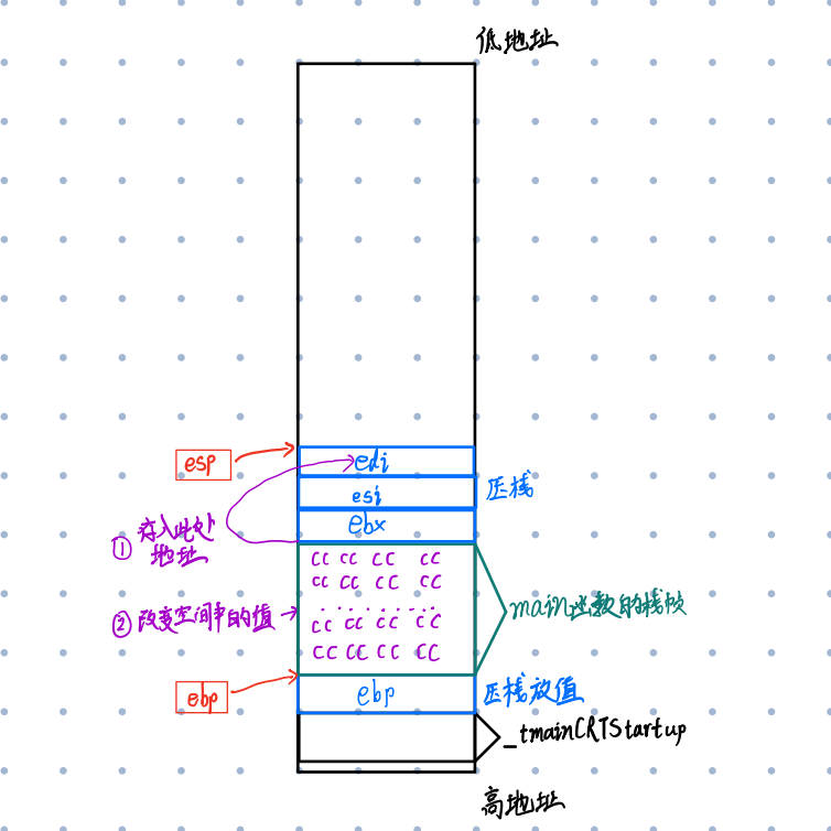 这些操作完成以后,edi会存入main函数栈顶的地址,在之后会产生重要作用。这一步完成后,main函数空间的值将会被完全改变,变成cccccccc……经过这些,main函数的空间才算开辟完成。?