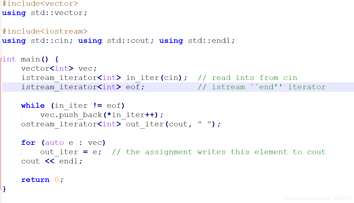 我给大家看看,大佬写的c++代码,我们可以学习的:  我真的看了这个知识点,我都没有写过,只知道它是一种特殊的迭代器,叫流迭代器。 但现在不一样了,我就不停的敲代码,加深印象,试着去理解。 也真诚的希望大家多多练习,不要觉得机械重复没意思,想想以后自己工作了不也是机械的重复吗?不也是板砖吗?那也很没意思,坚持下去!
