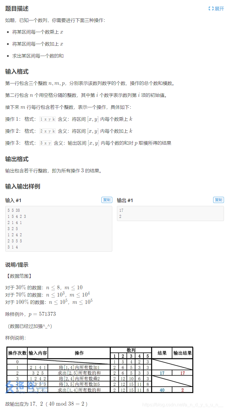 当我刚刚接触线段树区间乘法时,因为一直没想懂乘法和加法的懒标记怎么一起下推,上百度和CSDN搜索程序讲解,但搜到的绝大多数都是一些没有讲解,直挂代码的博文,很难让人看懂代码意思,往往会花费大量时间在理解变量的作用和操作的原理,因此为了方便初学者学习(也为了方便我以后复习),就写了这篇博文,希望对你有所帮助!