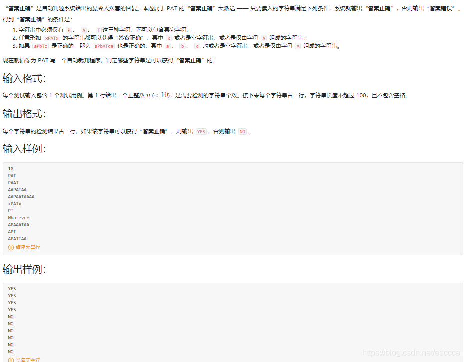 PAT都必须有,P和T有且只有一个,P和T之间必须有A 这个有一个规律,即a * b=c。可以参看输入样例中的PAAT (0x2=0)和 AAPATAA (2x1=2)和 AAPAATAAAA(2x2=4)。 APAAATAA不满足,输出NO