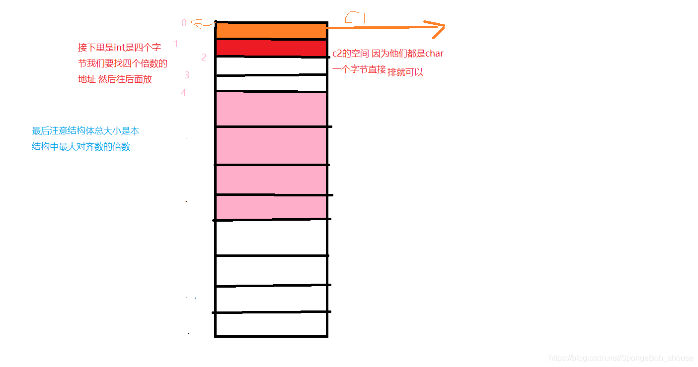 1. 第一个成员在与结构体变量偏移量为0的地址处。 2. 其他成员变量要对齐到某个数字(对齐数)的整数倍的地址处。 对齐数 = 编译器默认的一个对齐数 与 该成员大小的较小值。 VS中默认的值为8 3. 结构体总大小为最大对齐数(每个成员变量都有一个对齐数)的整数倍。//这一点很重要 4. 如果嵌套了结构体的情况,嵌套的结构体对齐到自己的最大对齐数的整数倍处,结构体的整 体大小就是所有最大对齐数(含嵌套结构体的对齐数)的整数倍。 struct S2 { char c1; char c2; int i; }; printf("%d\n", sizeof(struct S2));//这段代码应当如何计算 我们首成员不用管位置直接放置