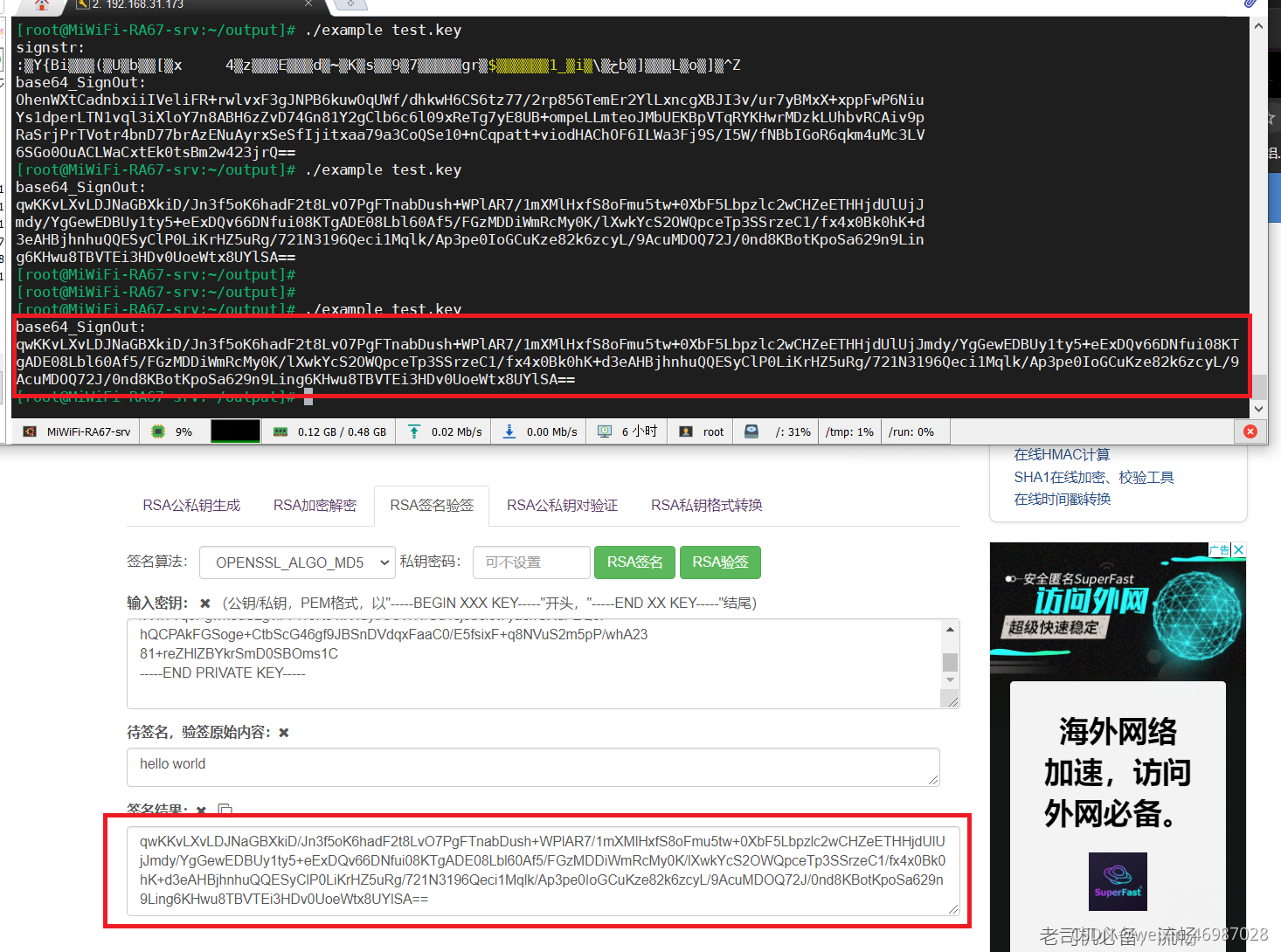 ?3.2 代码结果与在线签名结果对比(注:截图中的test.key? 就是3.1中的testkey.pem。因为后来觉得用pem后缀显得规范点就改成testkey.pem,截图懒得更换了。秘钥文件与文件名无关)
