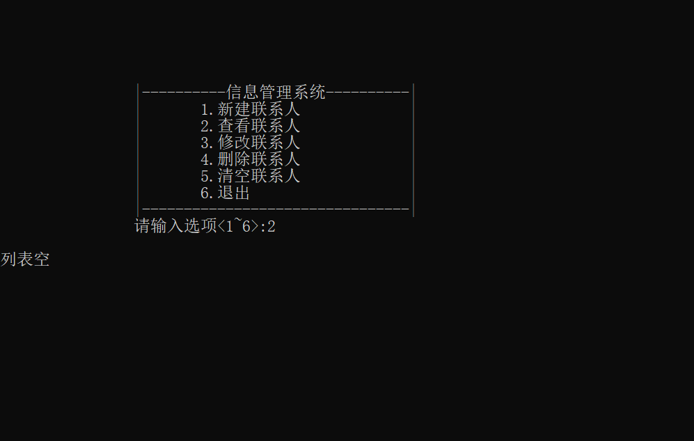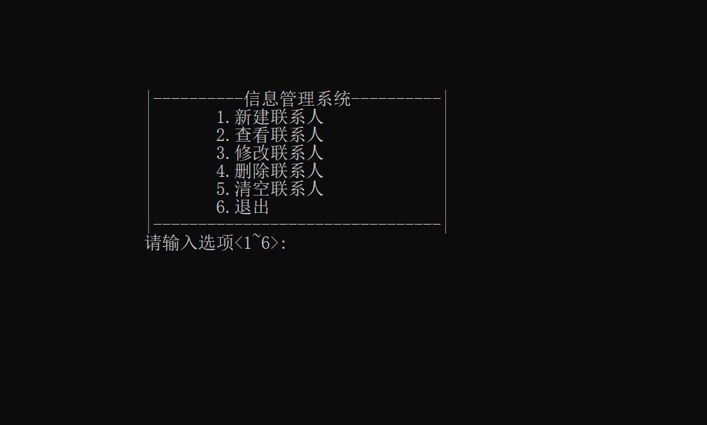 printf("\t\t|\t5.清空联系人 |\n");