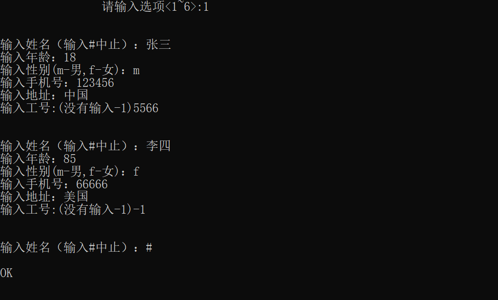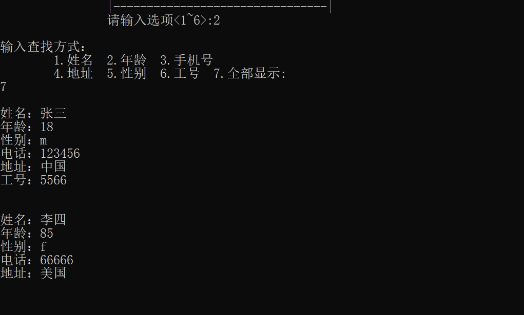 printf("输入查找方式:\n\t1.姓名\t2.年龄\t3.手机号\n\t4.地址\t5.性别\t6.工号\t7.全部显示:\n");
