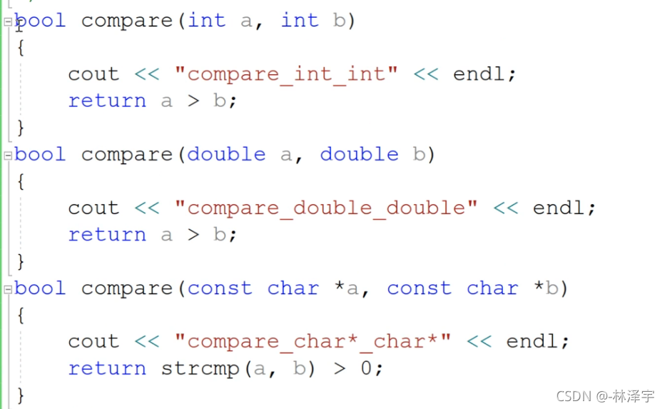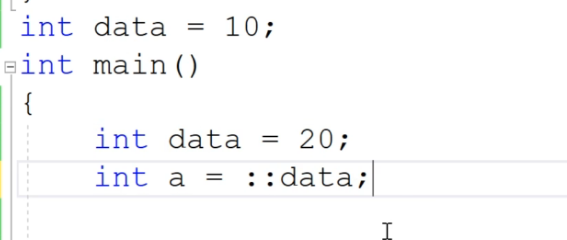 这个是什么原因?为什么第二个compare不会去调用double,double的函数重载?为什么要调用带int,int的函数重载? 而且我们看第二个编译结果,显示的是错误。也就是说,第三个compare调用也不是去调用带char*,char*的函数重载,而是也去调用了int,int的函数重载? 为什么都是一股脑地去调用这个函数呢?  在我们的C/C++,都是分作用域的,比如说,我们在全局作用域定义一个全局变量,在函数的局部作用域里面定义一个局部变量,这2个变量的名字是可以相同的。  当我们在函数的局部作用域去使用这个变量时,是优先调用当前最近的作用域定义的那个变量。 如果在局部作用域里面要调用全局作用域的相同名字的变量,可以这样写:  我们回到刚才讨论的代码compare,在全局有3个函数的定义,现在呢,我们在main函数局部进行了函数的声明,调用的话,有函数声明就足够了,main函数的3个compare函数在调用的时候,编译器就在最近的作用域,也就main函数局部作用域看到一个函数的声明,就是compare,所以大家都去调用这个compare函数了。 2.一组函数要称得上重载,一定先是处在同一个作用域当中的。