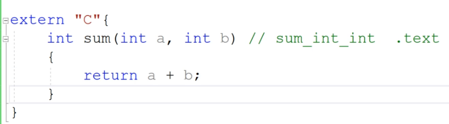 告诉编译器,这个函数是C语言规则下生成的,所以你在生成符号的时候,不要按照C++的方式,要按照C语言的规则去生成符号。   C 调用 C++:无法直接调用了!怎么办? 把C++源码扩在extern "C"
