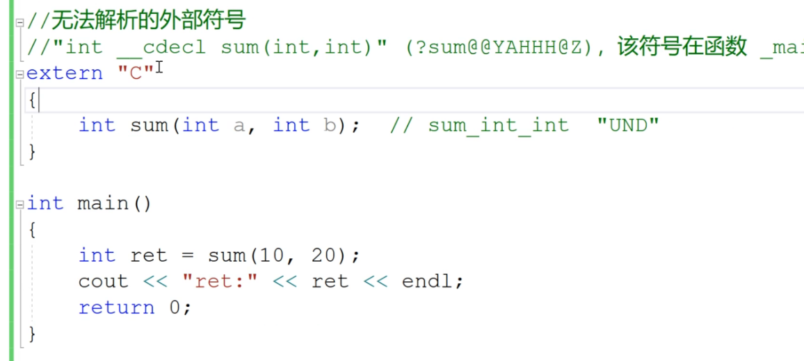 在C++文件中的sum函数实现外部扩上extern C  在C++文件中告诉编译器,按照C语言的方式生成这个函数的符号 这样在C文件调用这个函数,就可以找到了。