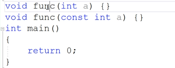 3.const或者volatile的时候,是怎么影响形参类型的?  这2个func函数的作用域相同,函数名也相同,看它们的参数列表,是相同还是不相同呢?  对于编译器来说,它看这2个func函数是一样的。 我们去查看一下