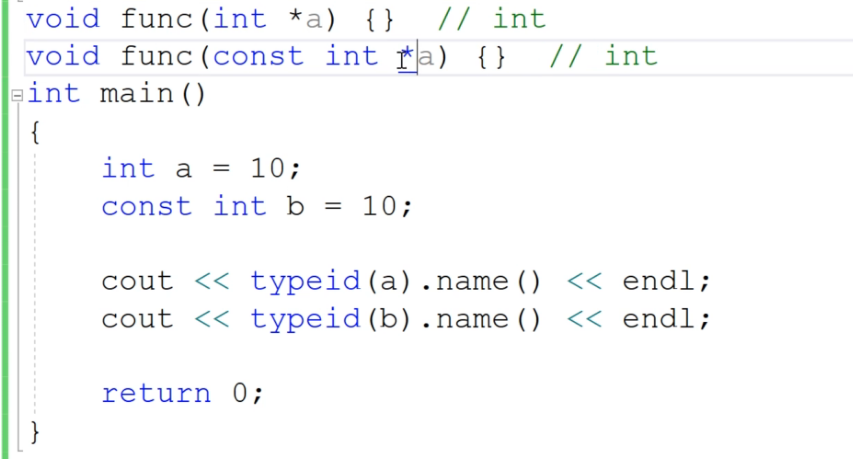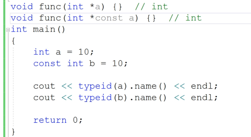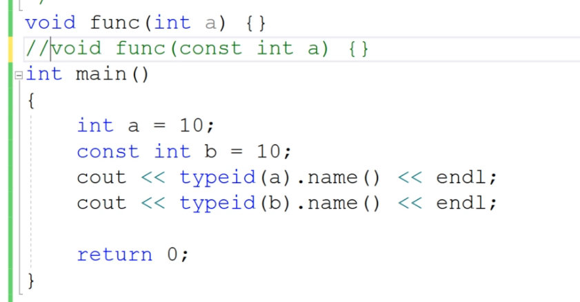 对于编译器来说,它们两个函数的形参都是整型int,函数的符号是一模一样的 我们加个指针看看效果,好像就运行可以了   如果我们把指针移动到const的前面   又报错了。 const或者volatile的时候,是怎么影响形参类型的?
