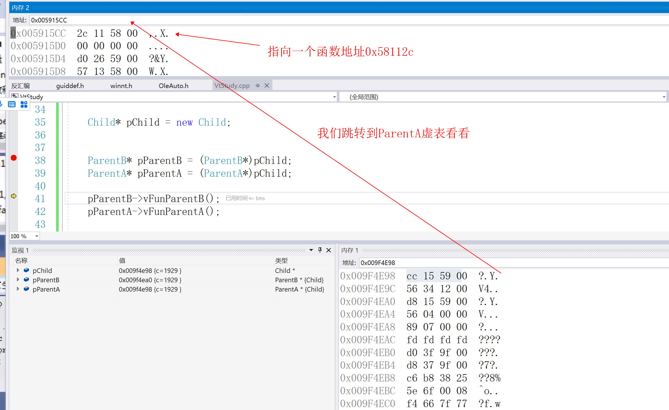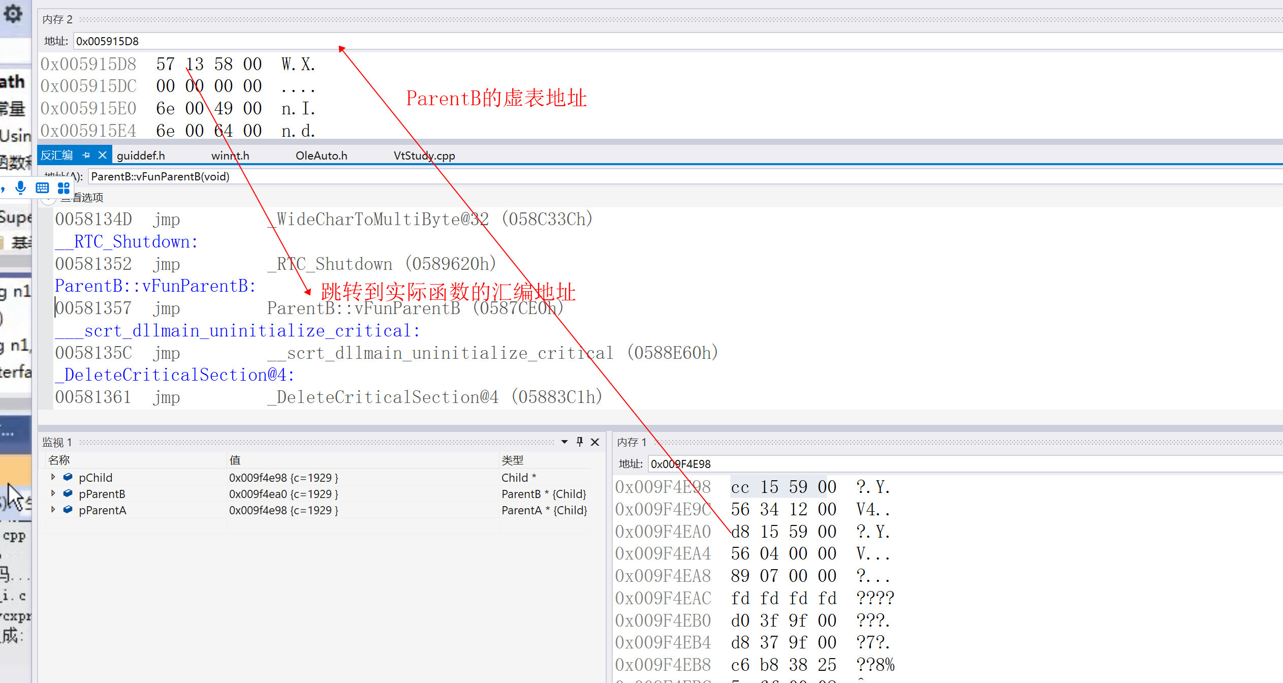 当我们不适用void* 强转后编译器会帮我进行偏移计算会迫使ParentB 偏移8字节,从而使pParentB 指向正确的内存虚表。  在单一继承下不会出现这类问题,我们最后看下本例中的内存结构: