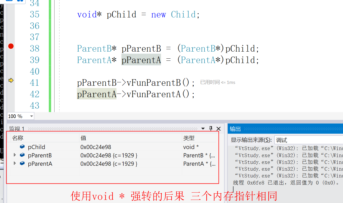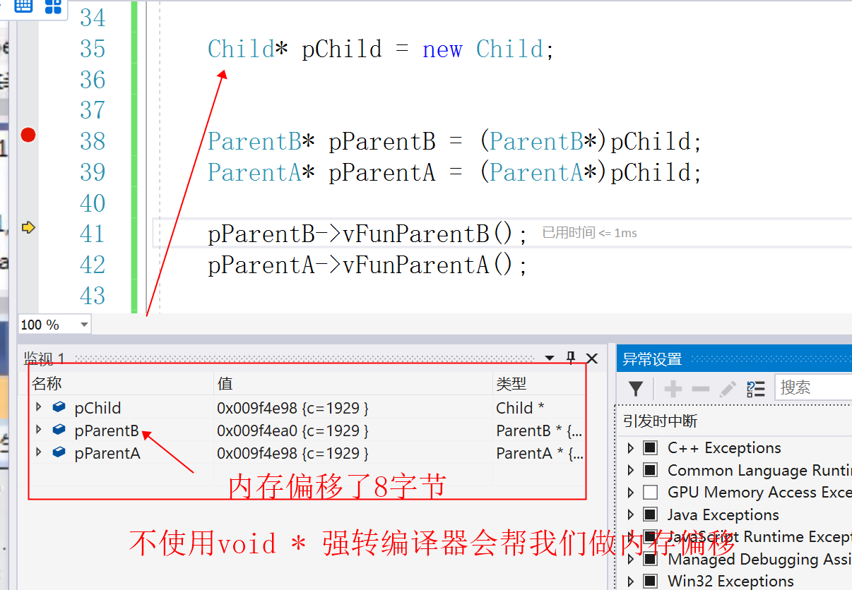 在多重继承下Child 内存结构应该是如下结构:  由于我们使用 void * 类型强转为ParentB ,ParentA 返回的指针地址依然是ParentA ,而没有做内存偏移计算.如下图所示: