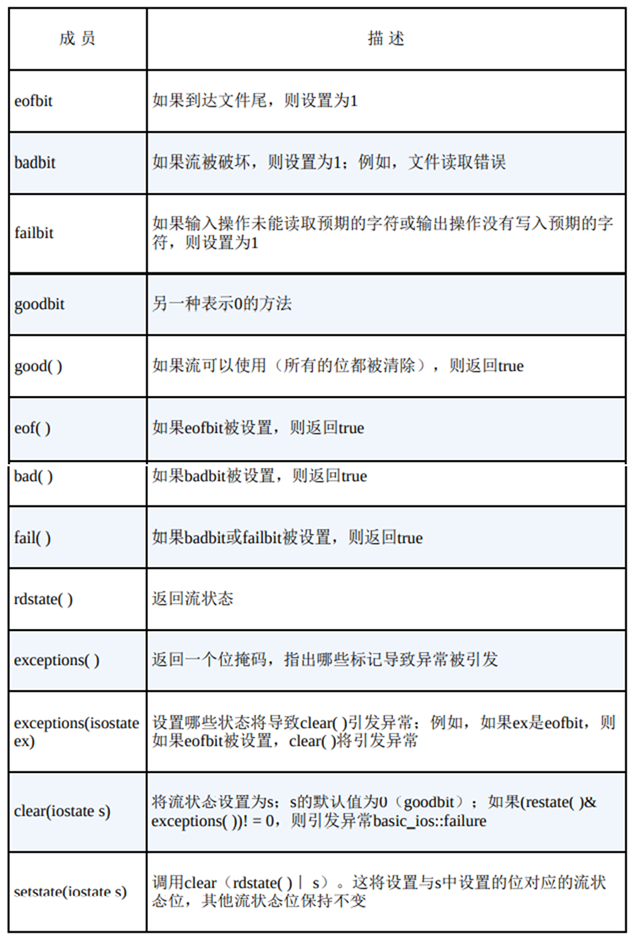 ios_base::in | 打开文件,以便读取 | ios_base::out | 打开文件,以便写入 | ios_base::ate | 打开文件,并移到文件尾 | ios_base::app | 追加到文件尾 | ios_base::trunc | 如果文件存在,则截短文件 | ios_base::binary | 二进制文件 |
