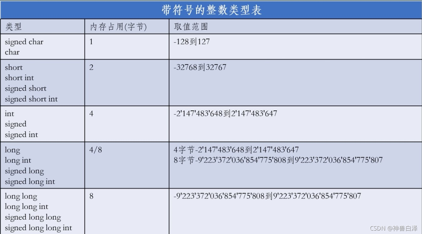 ?带符号的整数类型表: