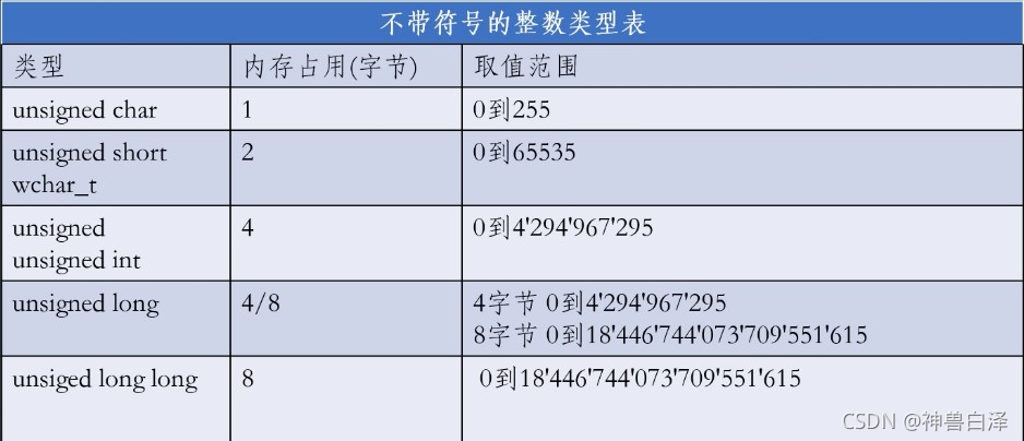 不带符号的整数类型表: