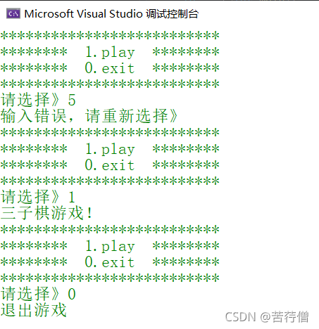 ?发现以上的代码已经基本实现我们想要的效果,只差当我们选择1时,不是打印三子棋游戏,而是真正开始游戏的模块内容了。