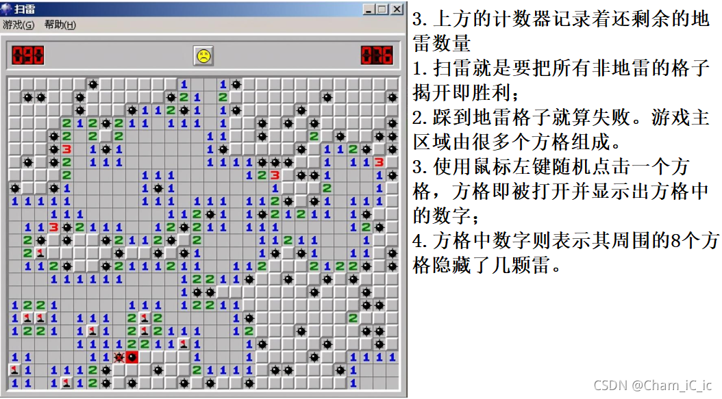 上次我们写了三子棋,回顾一下吧,用到了很简单的二维数组,全局变量,头文件的创建,函数的封装调用,循环分支。想必大家下来肯定都自己上手练了练的,看会了可不算会,要做就做话少本事大的人,不做屁多话稠的卢瑟,说可以,一做就歇菜,所以编程这条路上没有用眼睛成功的,所有的程序员都是勤于动手动脑的人,想100%成功就要200%的努力,好了回归正题,今天我们来完成三子棋的进阶版,扫雷,想必大家更不陌生,在大家买的第一部电脑上都有这部游戏,蓝灰色的界面,一个小黄脸,很多小格子藏着地雷等你去踩,规则我就不多说了,大家可以自行打开这款游戏回味一下, 我们直接来用C语言实现