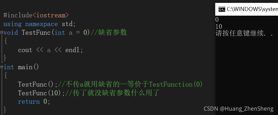 缺省参数是声明或定义函数时为函数的参数指定一个默认值。在调用该函数时,如果没有指定实参则采用该默认值,否则使用指定的实参。