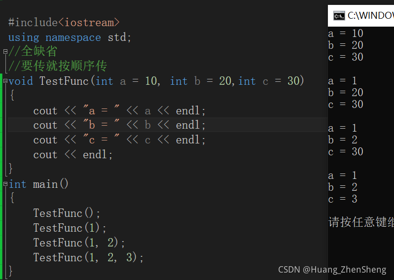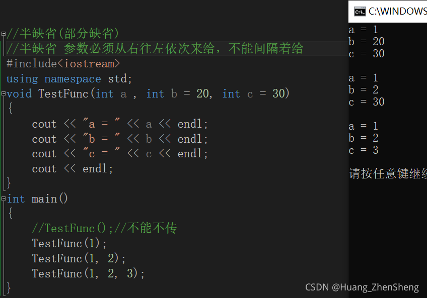 1. 半缺省参数必须从右往左依次来给出,不能间隔着给 2. 缺省参数不能在函数声明和定义中同时出现