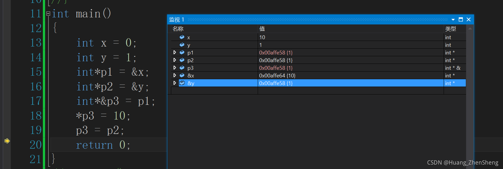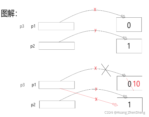 通过调式可以发现, 一开始p1,p3存的是x的地址,经过P3=P2,把P2的地址给了P3,P1