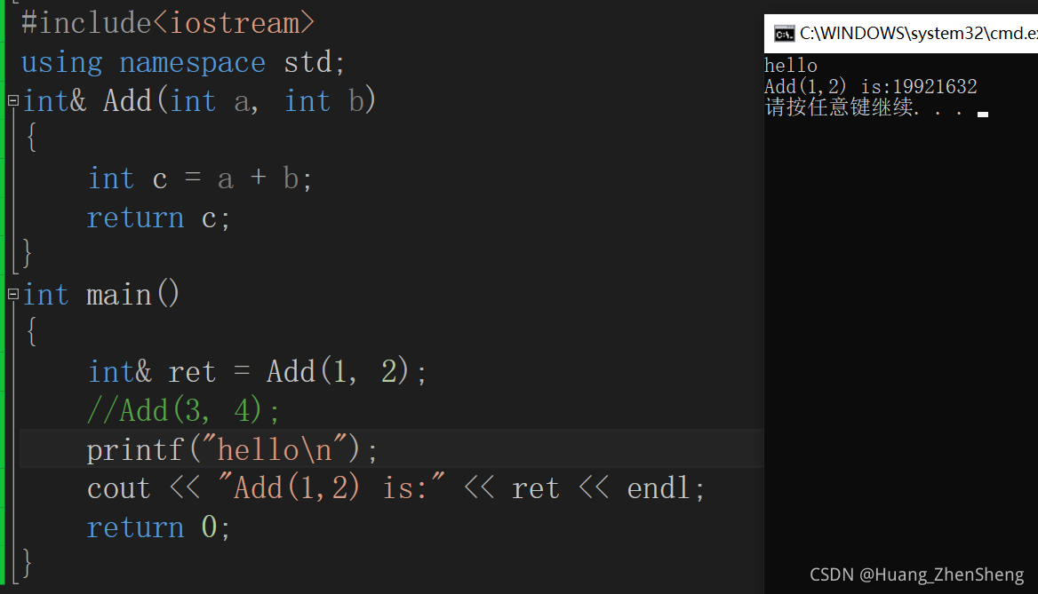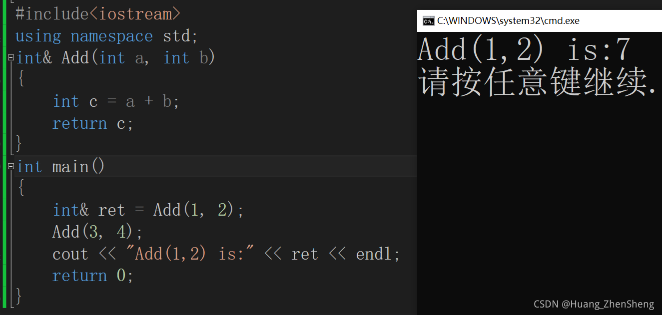 运行程序,可以发现VS上没有清理栈祯,我们进一步改动程序验证引用返回的危害性