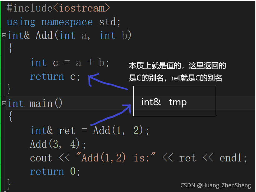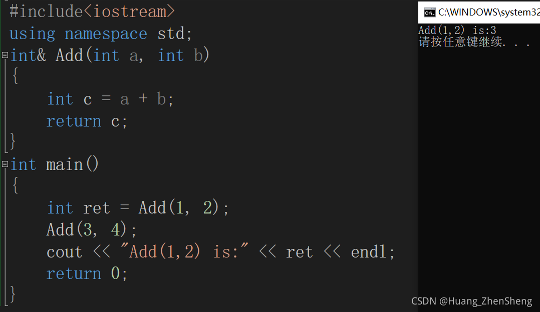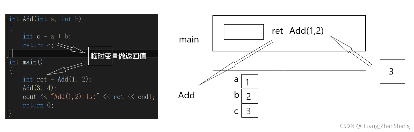调用Add函数的时候,1+2的结果给了C,return c好像就是把c作为返回值,拷贝给ret