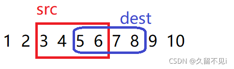 本题中src是待拷贝地址,dest是被修改地址,具体分为两种情况:一种是src>dest,也就是src地址在dest地址后面,需要从前向后拷贝字节;另一种是src<dest,也就是src地址在dest地址前面,需要从后向前拷贝地址。如图所示: