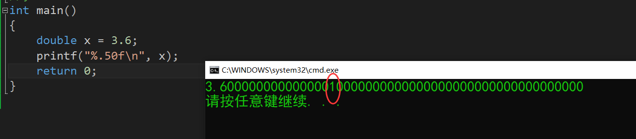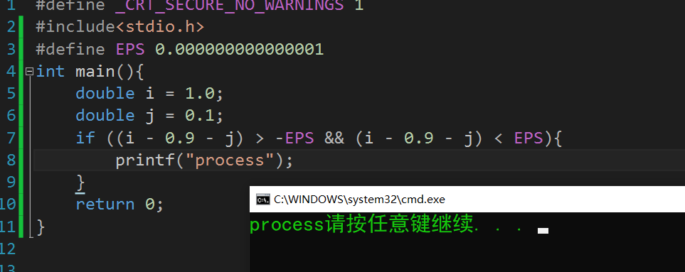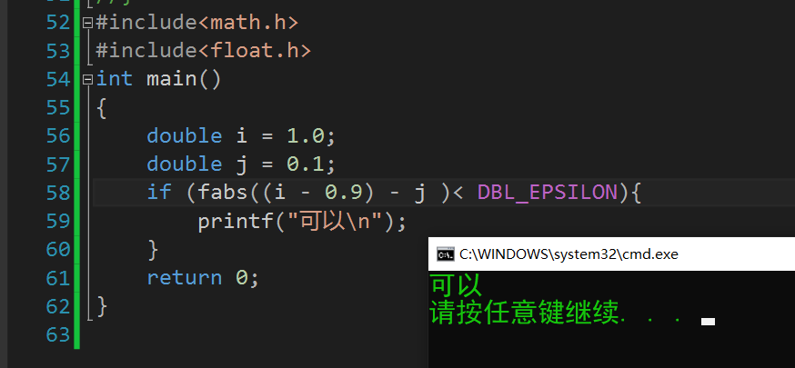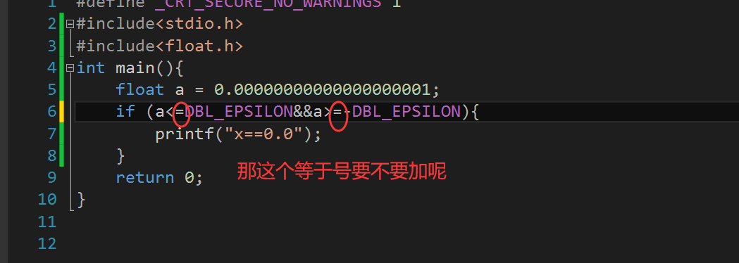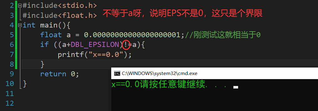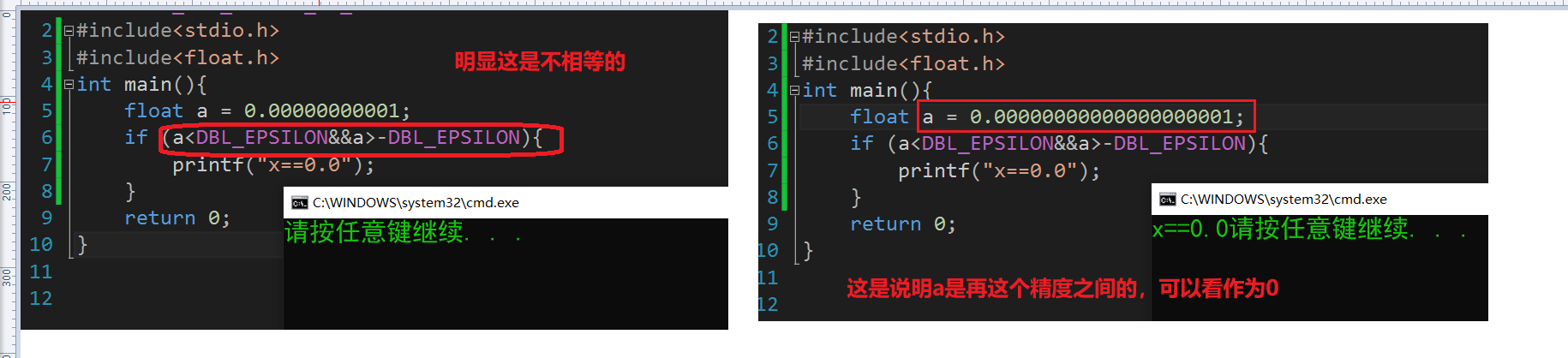 我们可以看到浮点数再内存存在精度的丢失 我们看到i是1.0 减 0.9应该等于0.1呀,但是啥也没打印这就是精度丢失的问题 所以浮点数不能直接用==比较 这可咋办呢 两个浮点数相比较可以用一个函数fabs,来比较两个浮点数相等不相等  fabs是求绝对值的函数,因为i-0.9-j不能等于纯零,所以C语言就规定两个数相减,要是结果小于这个误差就说这两个数相等 说明一下这个合法误差:因为浮点数再存储的时候是存在精度丢失的,俩个数不能直接比较相等,所以引用了这个误差,我画个图就明白了 图中是结果不为0,但在这个范围之内 这个精度我们还是可以自己自定义的  言归正传浮点数和零比较  如果和0比较,直接判断这个浮点数在不在这个精度之间