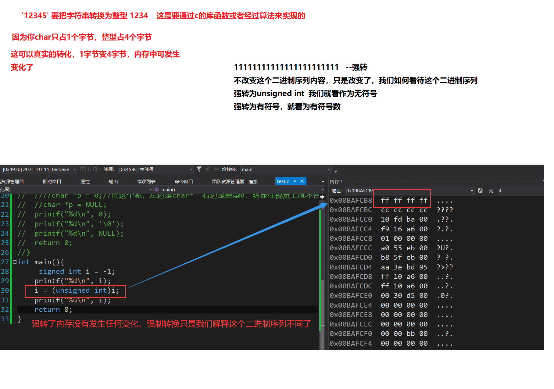 所以经上面所述,定义变量必须初始化,但是初始化,表达式两边的类型必须是相同的,比如说,一个double赋給int,不就发生截断了嘛 接下来,我们看一下,C语言中的三个0 看打印出来是一样的,这说明在数据层面是一样的,在类型层面是不一样的,解释一下  在C语言的内部只是把0强制准换为了void*类型的指针,在底层内存中存放的还是0值,内存中的数据没有发生任何变化,这我们详细解说一下强制类型转换;