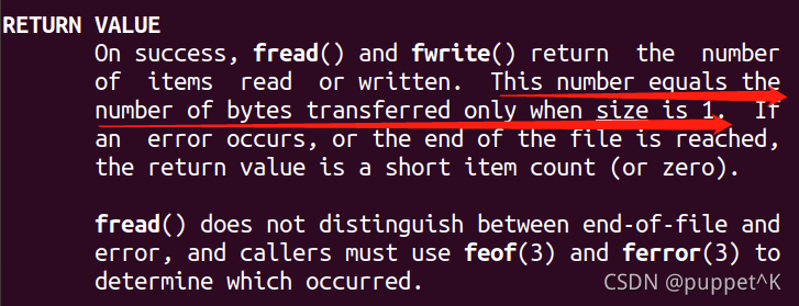 PS:这里对fwrite()、fread()返回值Linux函数手册的说明如下