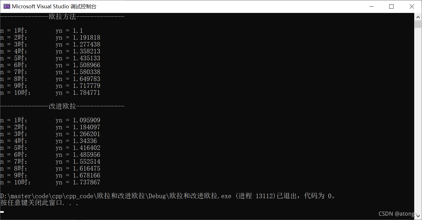 ????????在一阶常微分方程的数值解法中 ,常采用的欧拉方法,欧拉方法局部截断误差为O(2),所以欧拉方法是一阶方法,改进后的欧拉方法截断误差为O(3),所以改进后的欧拉方法是二阶方法,精度更高。本文将以具体一微分方程为例,使用C++分别采用欧拉方法和改进后的欧拉方法对其求解。