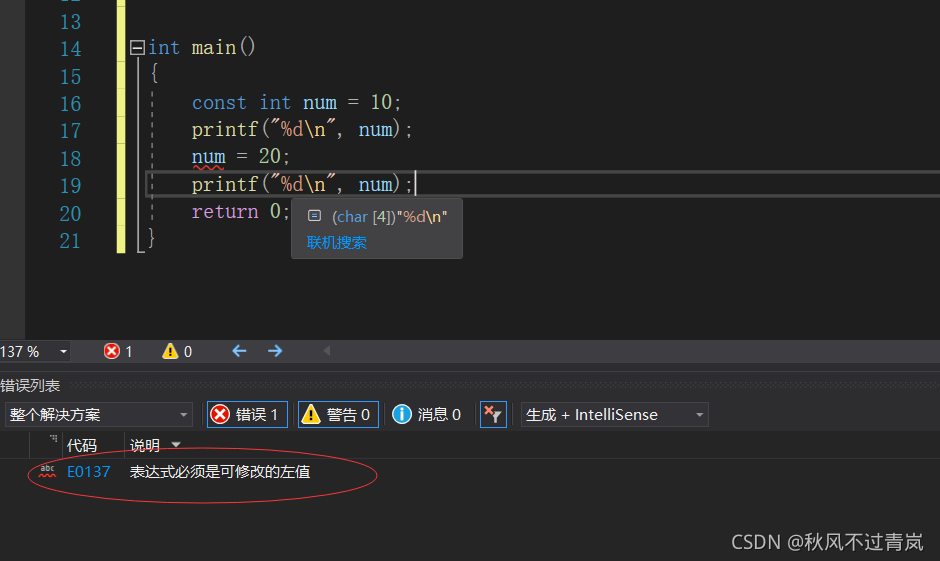 ? ? ?? 可见,当我们想要对num值进行修改时,编译器报了个错误,说表达式必须是可修改的左值。说明num被const修饰以后具有了不可改性。但是为什么说他的本质还是变量呢?变(常量)了但是没有完全变。其实想要验证也很简单。