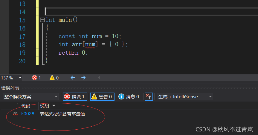 ? ? ?? 当我们用呗const修饰过的num给数组大小进行初始化时,编译器又给我们报了个错误,说表达式必须含有常量,说明num就算被const修饰过后依然不是一个常量。只是拥有了常量不可被更改的特性。const关键字一般是用来保护函数所传参数的,保护参数不会被修改,这里还是以后再讲。