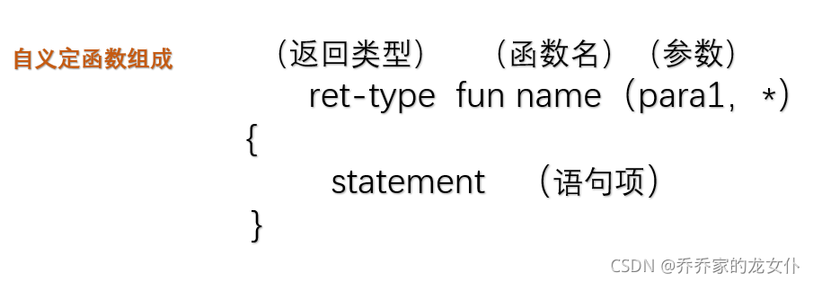 ## 自定义函数👏 ? 明白了函数声明,自义定函数就更为重要了,要是库函数能干所有事,那还要程序员干嘛。和库函数一样,有函数名,返回值类型和函数参数,不一样的是DIY,有极大的发挥空间;其基本组成如下:(手打勿喷)